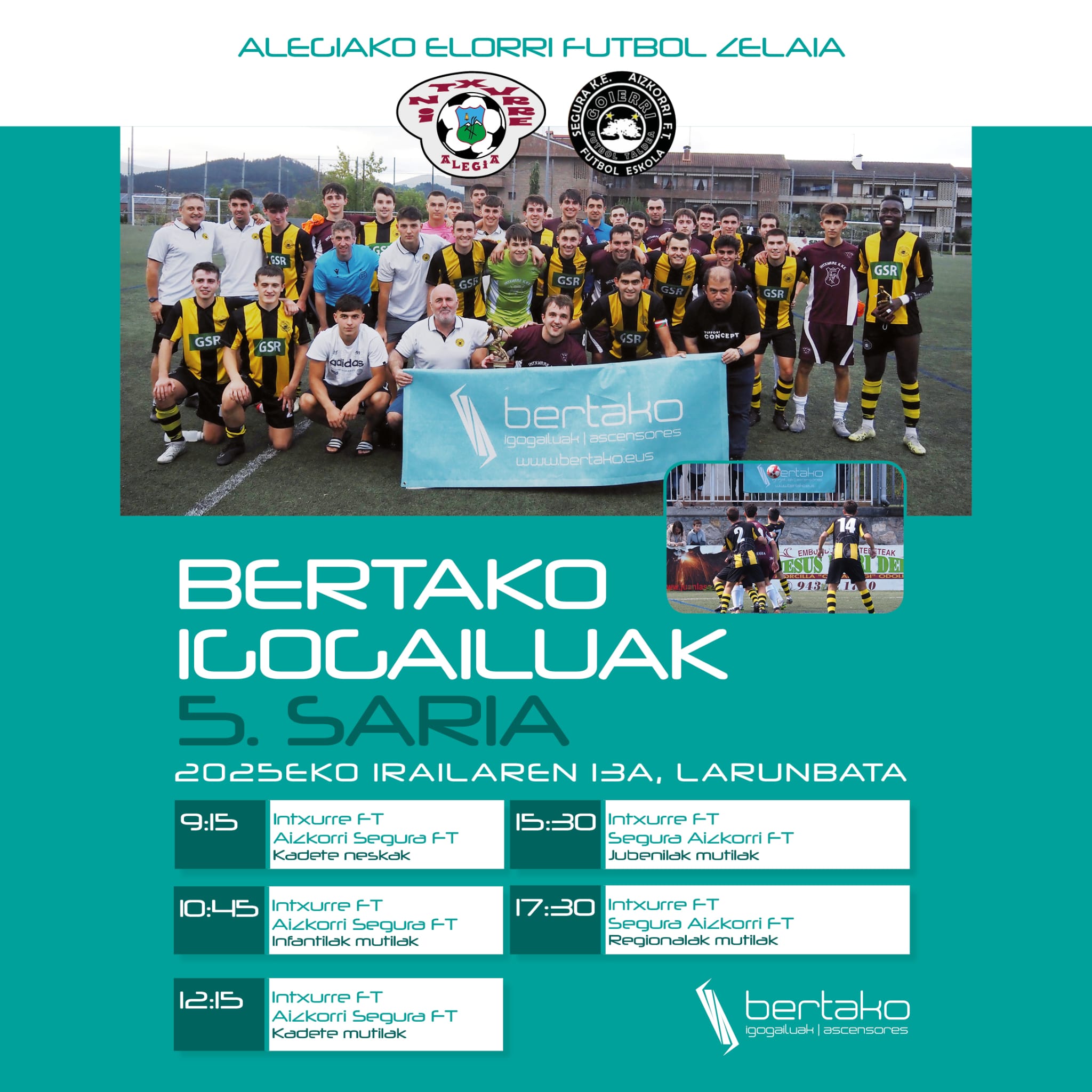 Alegiako Intxurre eta Segurako Segura Aizkorri futbol klubak elkarren artean lehiatuko dira bihar, 5. Bertako Igogailuak Txapelketan. Guztira bost partida jokatuko dituzte: 09:15ean hasita, kadete neskek jokatuko dute; 10:45ean, infantil mutilek; 12:15ean, kadete mutilek; 15:30ean, jubenil mutilek; eta 17:30ean, erregional mailako mutilek.