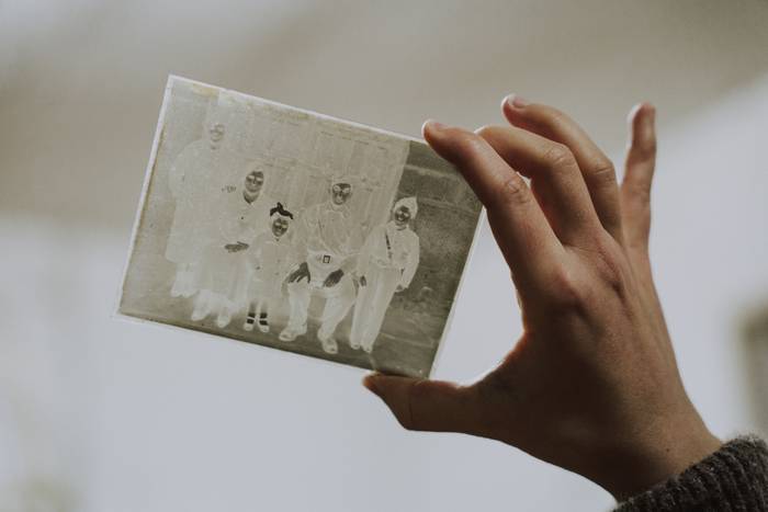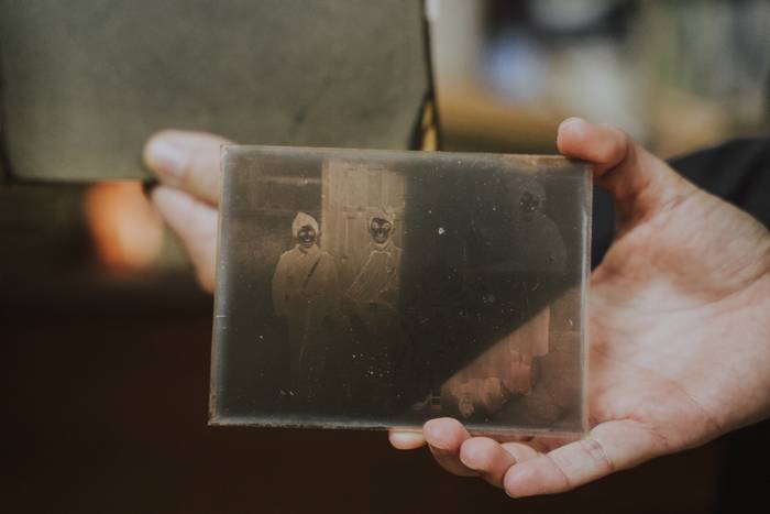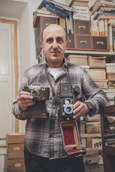 Intxausti: Eta badago beste ezberdintasun bat ere. Nire aitona 1913an hasi zen, data horretakoak dira lehen artxiboak. 1950. urte ingurura arte ikusten da aitonaren lana argazkilaritzan; batez ere, kristalezko negatiboak dira. Nire aita, aldiz, 14 urterekin hasi zen, 1940 inguruan. Hor dago aldaketa kristaletik zeluloidera. 48. urtean soldadu joan zen 51. urtera arte —3 urteko soldaduska egin zuen Afrikan—. 1951 inguruan itzuli zenean hasi zen argazkilaritzan profesionalki. Soldaduskako karta batzuk topatu ditugu, eta haietan amonak kontatzen zion aitona oso lanpetuta zebilela eta ea noiz itzuli behar zuen galdetu, aitonari lagundu ahal izateko behar zutela, batez ere, argazkilaritzarekin. Hor hasi zuen ibilbide profesionala.