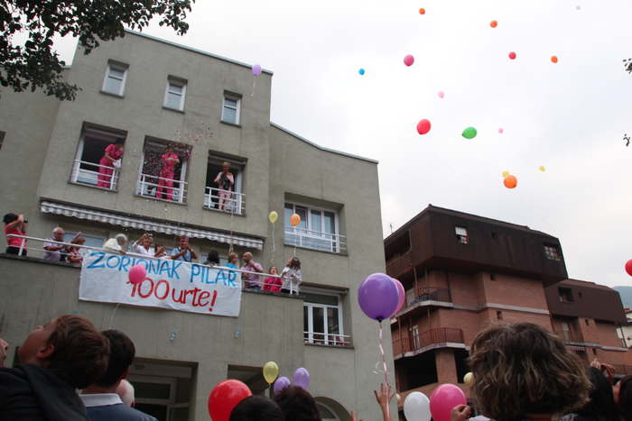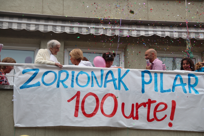 Santio Egoitzan 100 urte betetzen dituen hirugarren emakumea da Pilar, eta bere urtebetetzea ospatzeko festa handi bat egin dute. Goizean, mezaren ondoren, ekitaldi instituzionala egin dute. Bazkalostean, kontzertua izan dute, eta amaitzeko 100 globo jaurti dituzte zerura. Zorionak, Pilar!