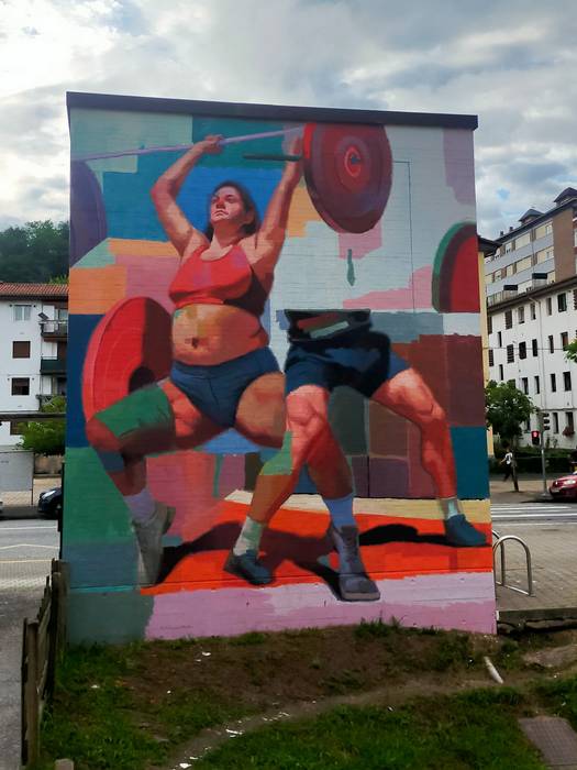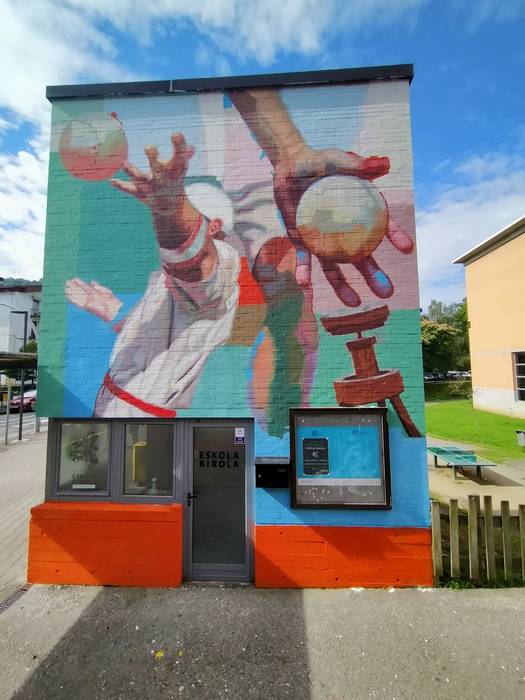 Boleibol kirolaren irudian emakume jokalari bat agertzen da more koloreko elastikoarekin, Aiztondo nesken boleibol taldearen kolorearekin. Gure herrian tradizio luzea duen halterofilia kirola ere presente dago eta horma irudian agertzen den pultsularietako batek, Zizurkil eta Villabonako Danok Danena taldeak erabiltzen dituen koloreak ditu elastikoan.