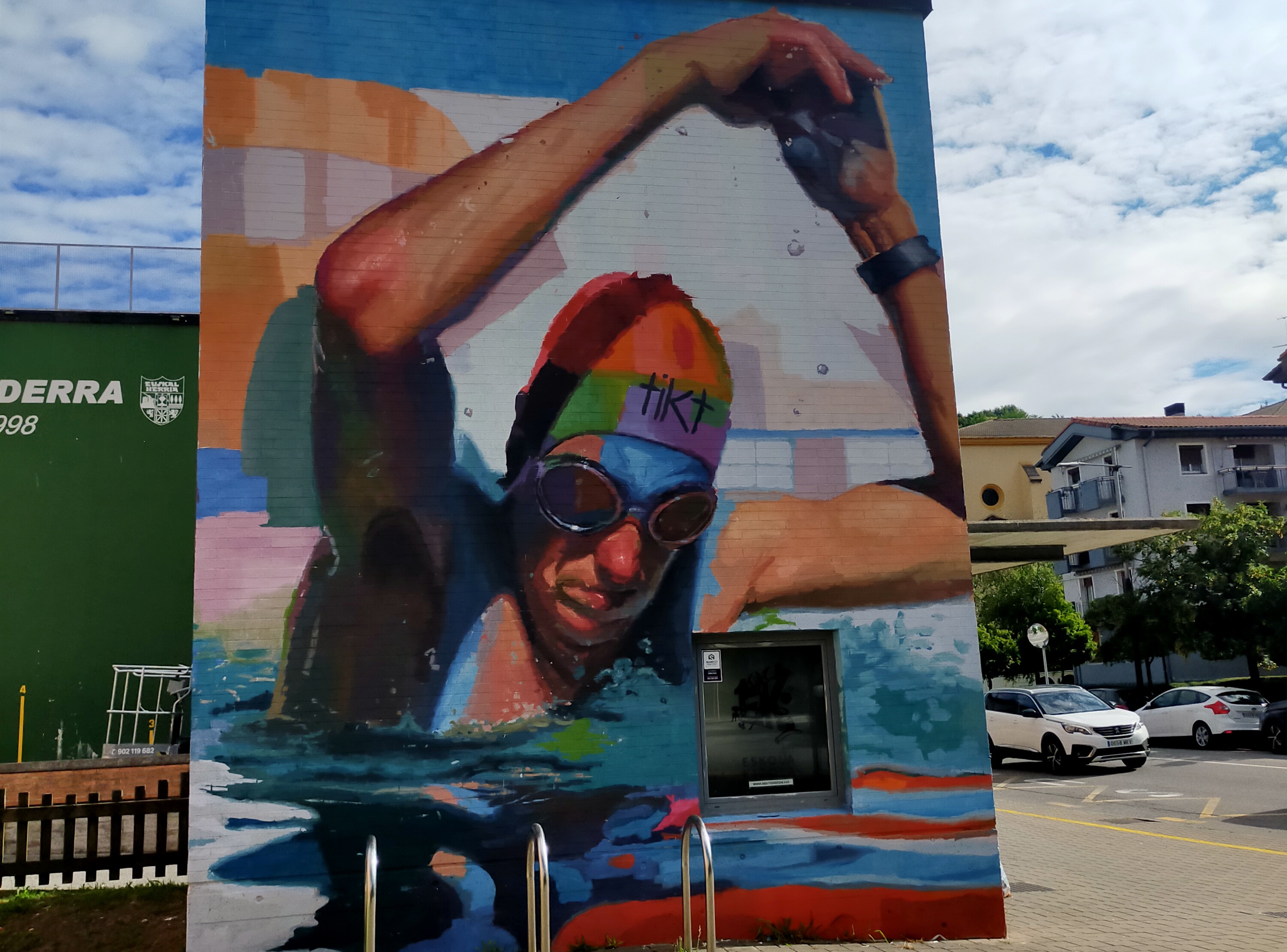 Eskola Kiroleko eraikinak lau fatxada dituela baliatuta, Nexgraff artistak lau kirol ezberdin irudikatu ditu, eta Amasa-Villabonan kirol hauetan lehiatzen duten taldeak daudela kontuan eduki nahi izan du. Igeriketako muralean, igerilariaren txanoan T ikt hizkiak agertzen dira, Olaederra kiroldegian aritzen den Tolosaldea IKT igeriketa taldeari erreferentzia eginez.