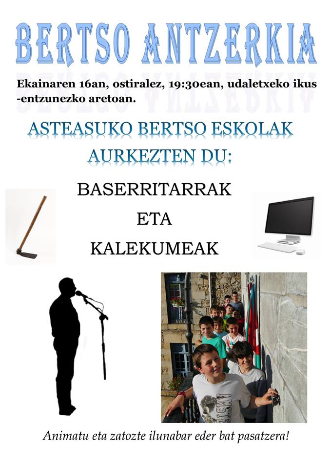 Ekainaren 16an, ostiralez, 19:30ean udaletxeko ikus-entzunezko aretoan eskainiko du bertso antzerkia, Asteasuko bertso eskolak.
