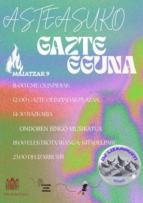Hirugarren aldiz Gazte Eguna egingo dute Asteasun. Maiatzaren 9rako antolatu dute egitaraua eta horren barruan antolatzaileek iragarri dute gazte olinpiadak, bazkaria eta bazkalondoan sorpresak izango direla. Iluntze-gau parterako, elektrotxaranga eta DJa izango dira.