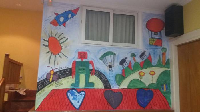 Etxolak berritze bat behar zuela eta murala egitearena pentsatu zuten haur txokotik. Ostegunean elkartu ziren eta haur bakoitzak nahi zuen marrazkia egin, eta gero erakusketa jarri zuten jubilatuen elkartean. Marrazki horiek hartu eta irudi bakoitzetik zerbait hartu eta jarri dute muralean. "Beraiek jolastuko duten lokalean denboran iraungo duen marrazki bat egongo da, eta horrek Etxola bere sentitu dezaten lagunduko du", azaldu du Garmendiak.