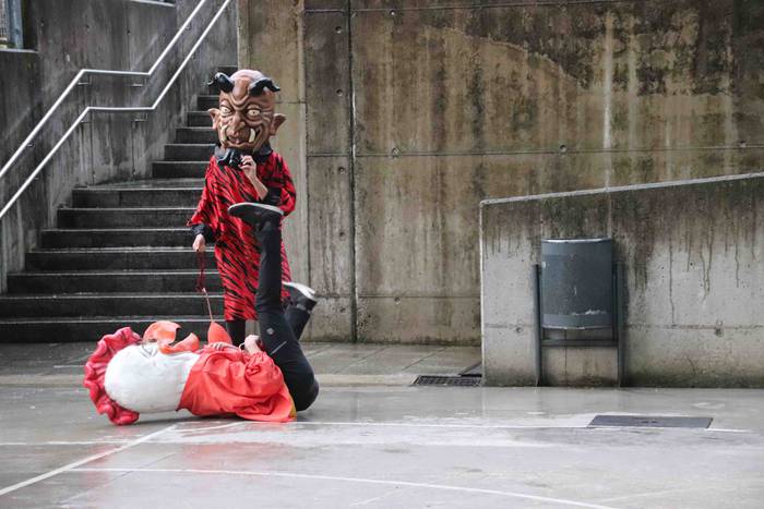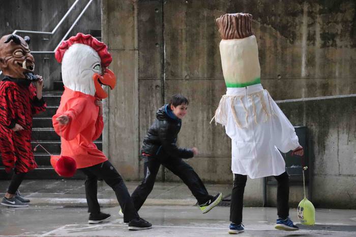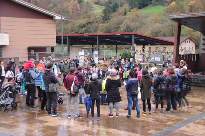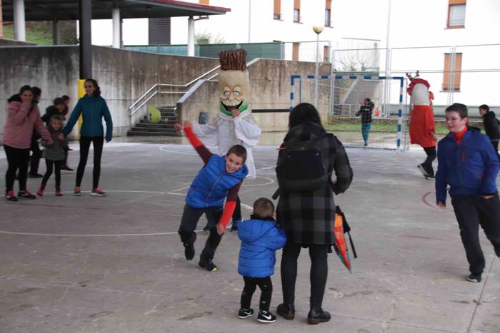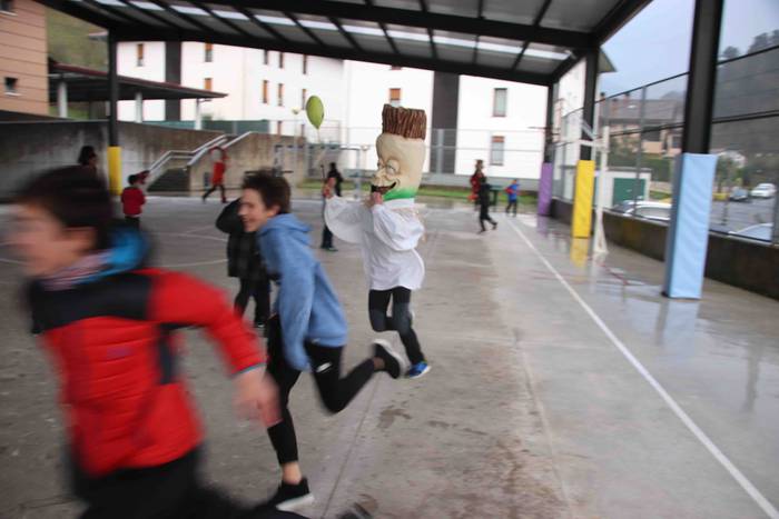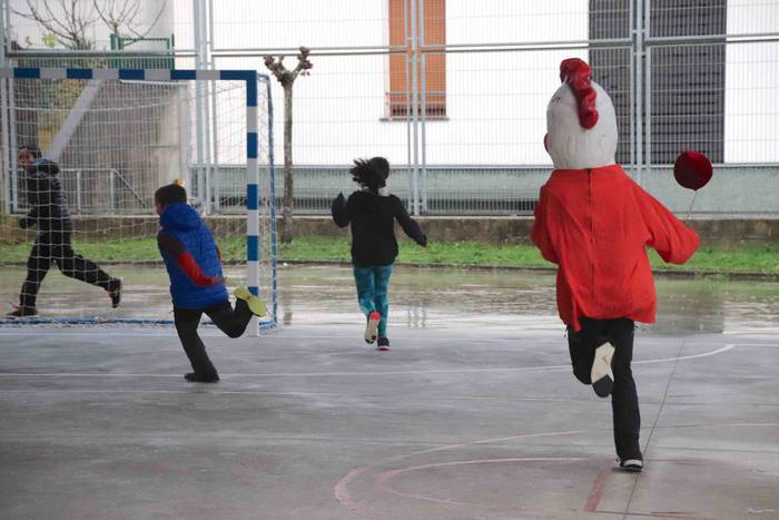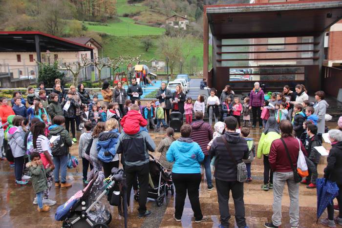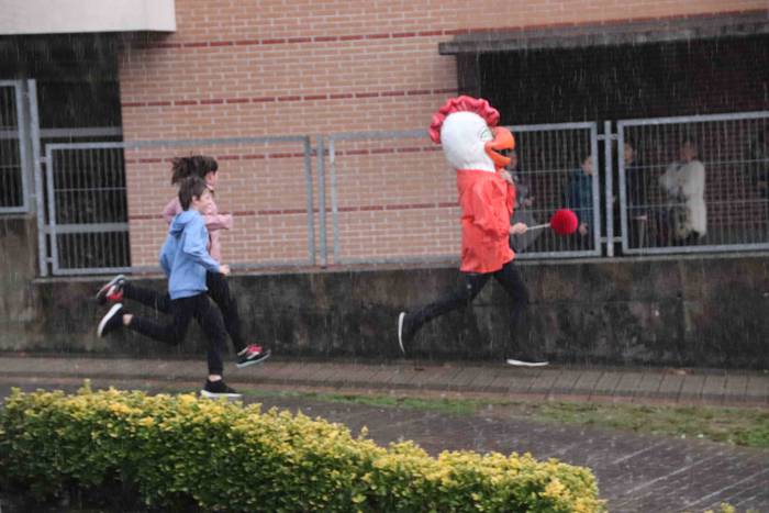 Kantatzeari utzi eta euri zaparrada galanta bota du. Hori dela eta, buruhandiak eskolako estalpean ibili dira batera eta bestera, gaztetxoenak aztoratuz.