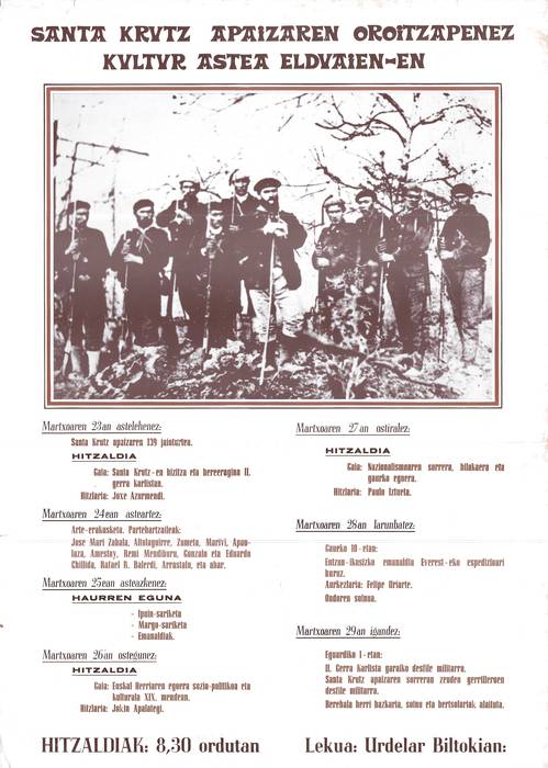 Udal ordezkariek azpimarratu dute aurretik ere gogoratu izan dutela Santa Kruz apaiza Elduainen. 1980ko hamarkada hasieran, esate baterako, kultur astea antolatu zuten Urdelar biltokian, eta, besteak beste, Joxe Azurmendi, Jokin Apalategi edo Paulo Iztuetak eman zituzten hitzaldiak. Remigio Mendiburu, Eduardo Chillida, Rafael R. Balerdi eta Jose Luis Zumetaren lanekin osatutako arte erakusketa bat ere jarri zuten ikusgai, eta astea borobiltzeko, II. Gerra Karlistako desfile militarra egin zuten. Egitaraua herri bazkariarekin, trikitilariekin eta bertsolariekin osatu zuten.
