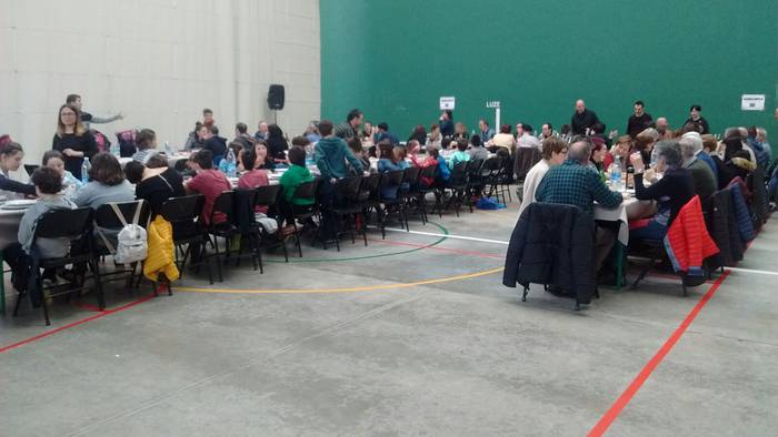 Plazako ekitaldia bukatu ondoren, triki-poteoaren ordua iritsi da. Ondoren, bazkaria egiten hasi dira frontoian, 90 bat herritar, eta bertan bertsoak entzuteko aukera ere izango da.