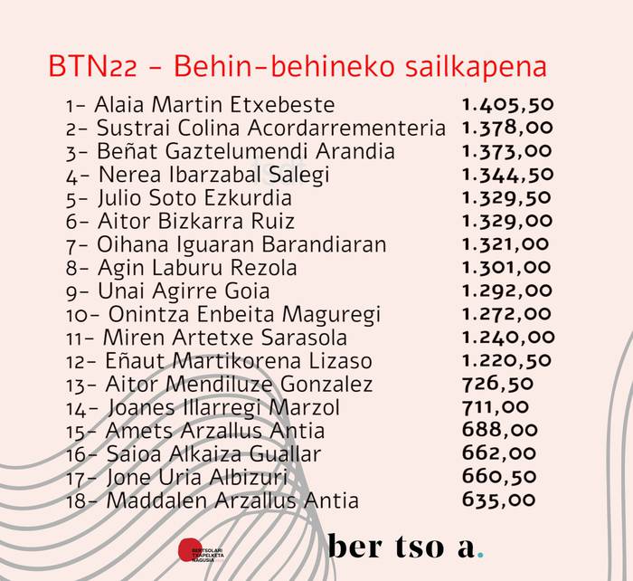 Larunbatean gainera, Iruñeako finalean Maialen Lujanbiorekin batera abestuko duten zazpi bertsolariak nortzuk izango diren jakingo da. Jarraian, bigarren fase honetako behin-behineko sailkapen taula: