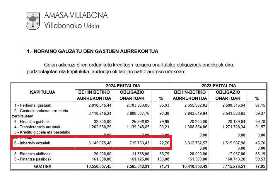 Beatriz Unzue buru duen EH Bilduko gobernuak 2023an 3.145.075,48 euro zituen inbertsioak gauzatzeko. Baina, urte amaieran kopuru horren % 77, 24 erabili gabe utzi zuen; izan ere, aurreikusitako diru kopurutik 715.753,43 euro gastatu zituen, hau da erabil zezakeenaren % 22,76 besterik ez. Eta hori hala izan da udalak arkitekto bat, bi aparejadore eta lan-karga planifikatzeko bi langile dituelarik. Baliabideak baditu, beraz, baina ekimenik ez. Honetatik guztietatik hauxe ondorioztatzen da: EH Bilduk ez du ez kudeatzeko gaitasunik, ez borondaterik eta, ondorioz, udala geldirik dago eta herritarrak zaindu gabe. EH Bilduk egin beharreko lanei ekin ez, eta herriaren etorkizuna hipotekatu egiten ari da.