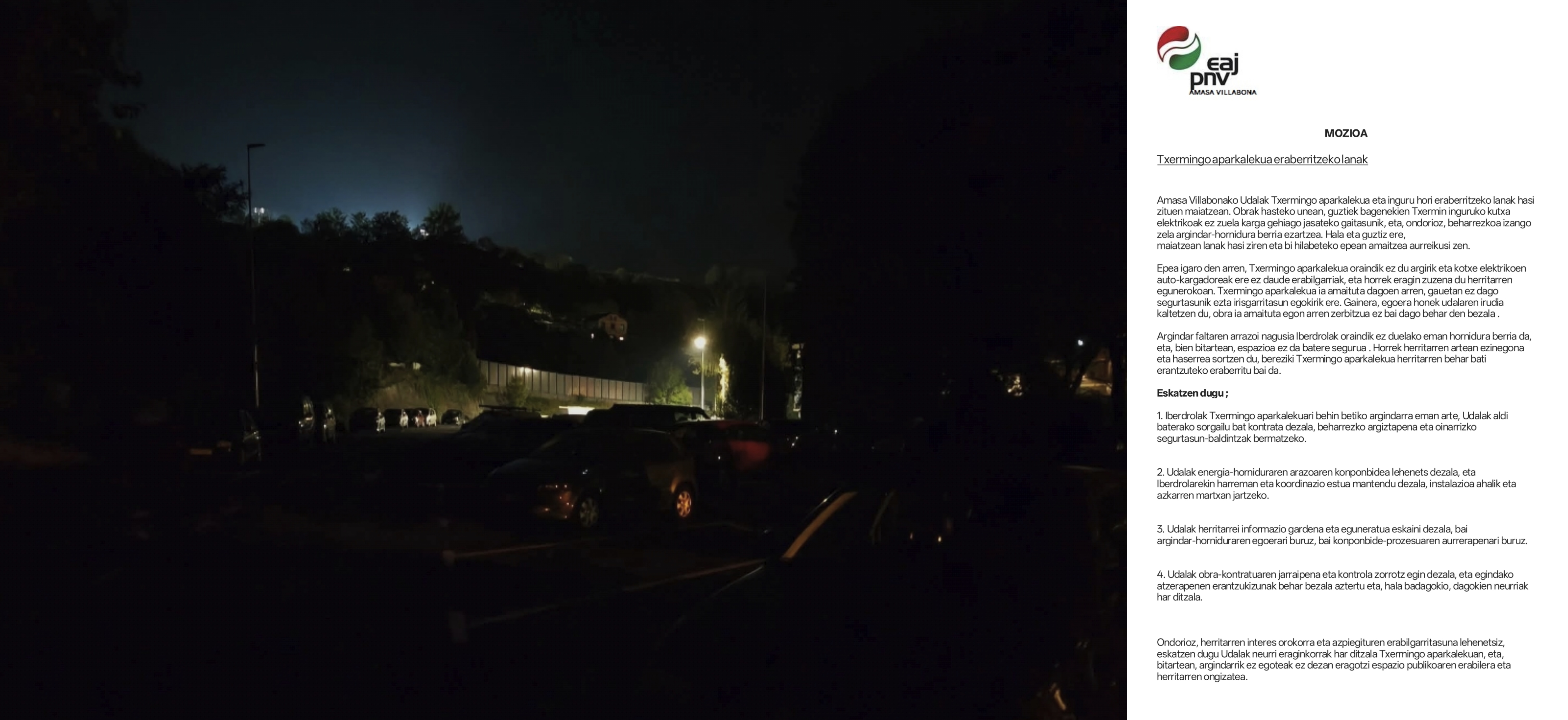 Ondorioz, herritarren interes orokorra eta azpiegituren erabilgarritasuna lehenetsiz, eskatzen dugu Udalak neurri eraginkorrak har ditzala Txermingo aparkalekuan, eta, bitartean, argindarrik ez egoteak ez dezan eragotzi espazio publikoaren erabilera eta herritarren ongizatea.