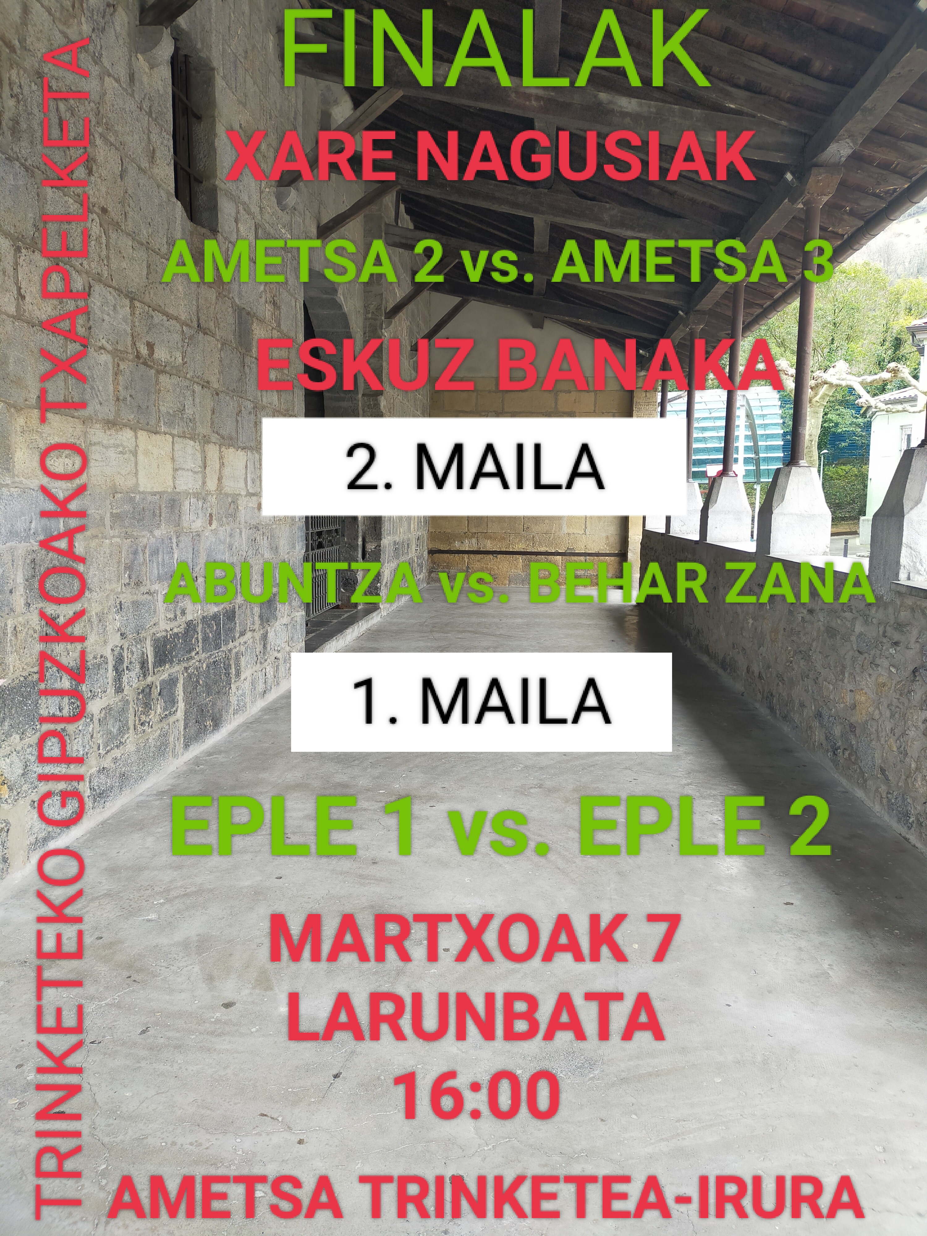 Lehen finala (16:00)  xarekoa izango da, eta Ametsa Pilota Elkarteko Mendizabal-Mujika eta Gibelalde-Iturbe bikoek jokatuko dute elkarren kontra.  Nagusi izan da Mendizabal-Mujika bikoa ligaxkan, eta   ligaxkako lehen postua eskuratuta, finalerako zuzenean sailkatu ziren.  Gibelalde-Iturbe bikoak, berriz,  finalerdia jokatu behar izan zuen Lopetegi II-Huizi bikoaren kontra,  eta finalerdi  on bat jokatu eta irabazita finalerako txartela lortu zuen Gibelalde-Irurbe bikoak. Aurreikuspenak betetzen badira,  faborito garbirik ez dago,  eta  partida lehiatua eta tentsio handikoa izatea aurreikusten da, batik bat, lau pilotariek euren maila ematen badute, eta, jakina, horrela izatea espero eta desio  dugu.  Hortaz,  xareko  partida estu,  lehiatu eta ikusgarria ikusi ahal izango da larunbatean(16:00) Ametsa trinketean.