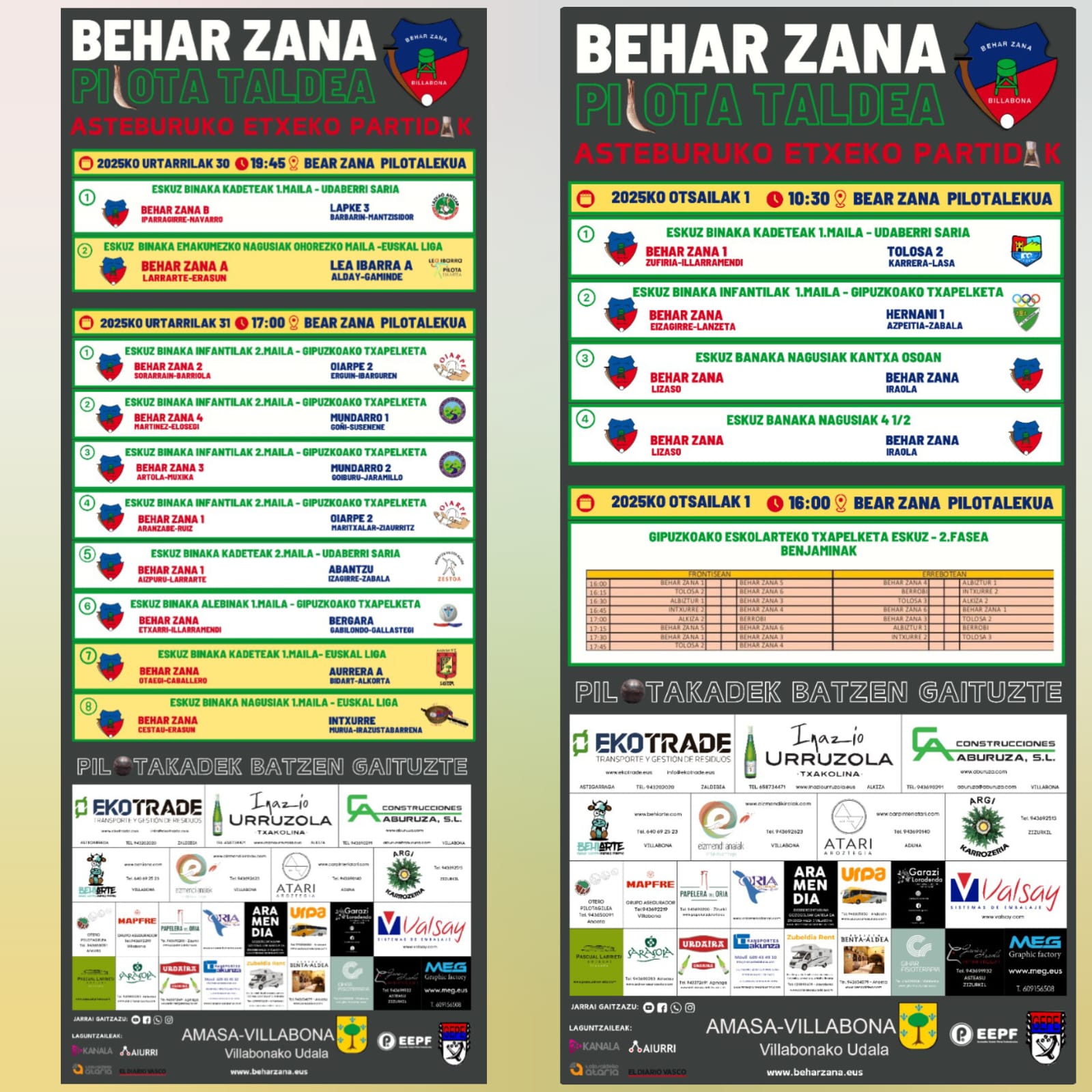 Aste honetan Villabonan 13 pilota partidu federatu eta beste 16 eskolartekoz gozatzeko aukera izango da. Euskal Liga, Gipuzkoako txapelketa zein Udaberri Sariko partidak izango dira, eskuz, joko garbian zein paletaz neskak eta gizonezkoak tartean.
