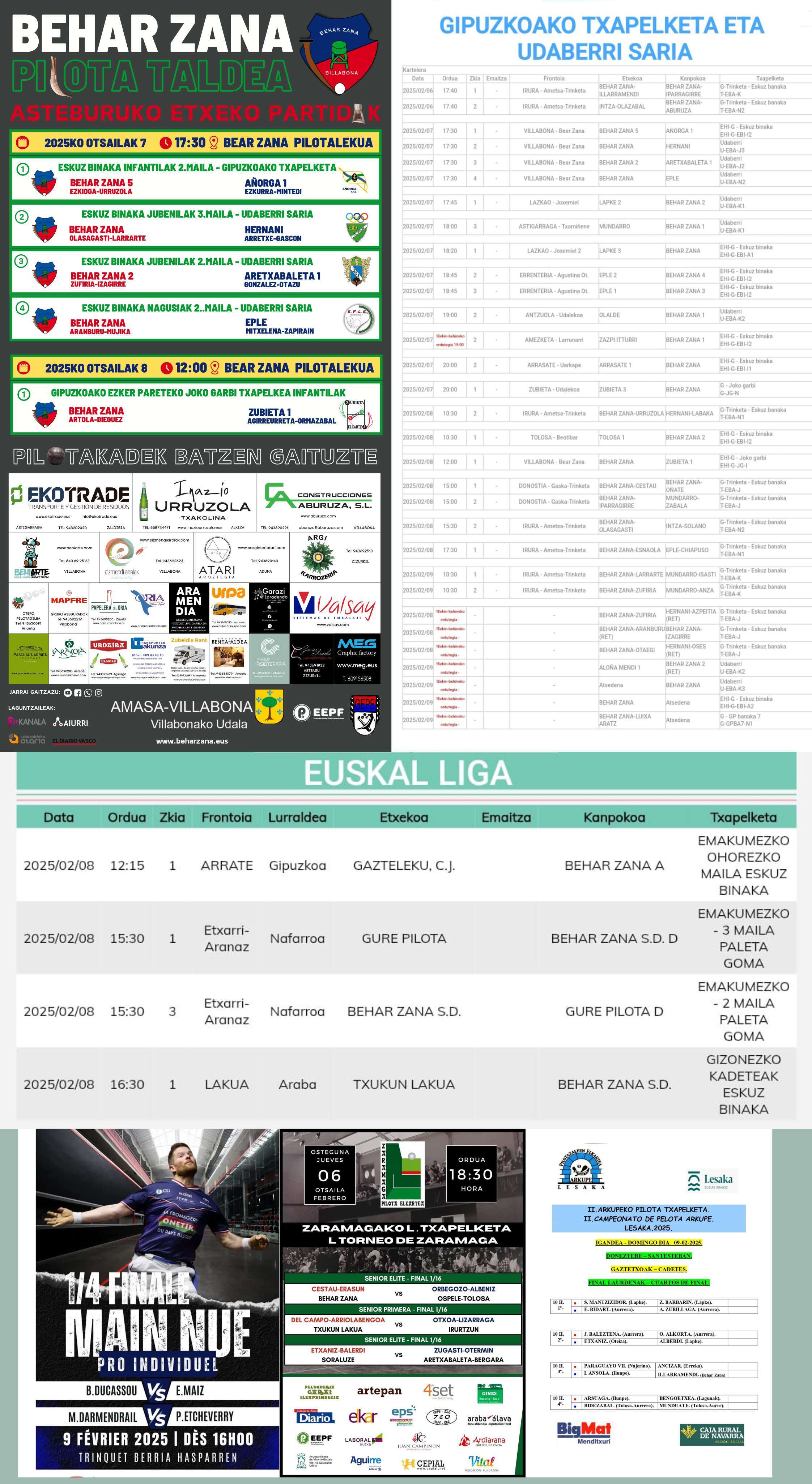 Zaramagako txapelketan elite mailan Cestau eta Erasunek, Arkupe txapelketan final laurdenak Illarramedik, EMC txapelketan Larrartek eta Maizek Ducassue-ren aurka jokatuko dute.