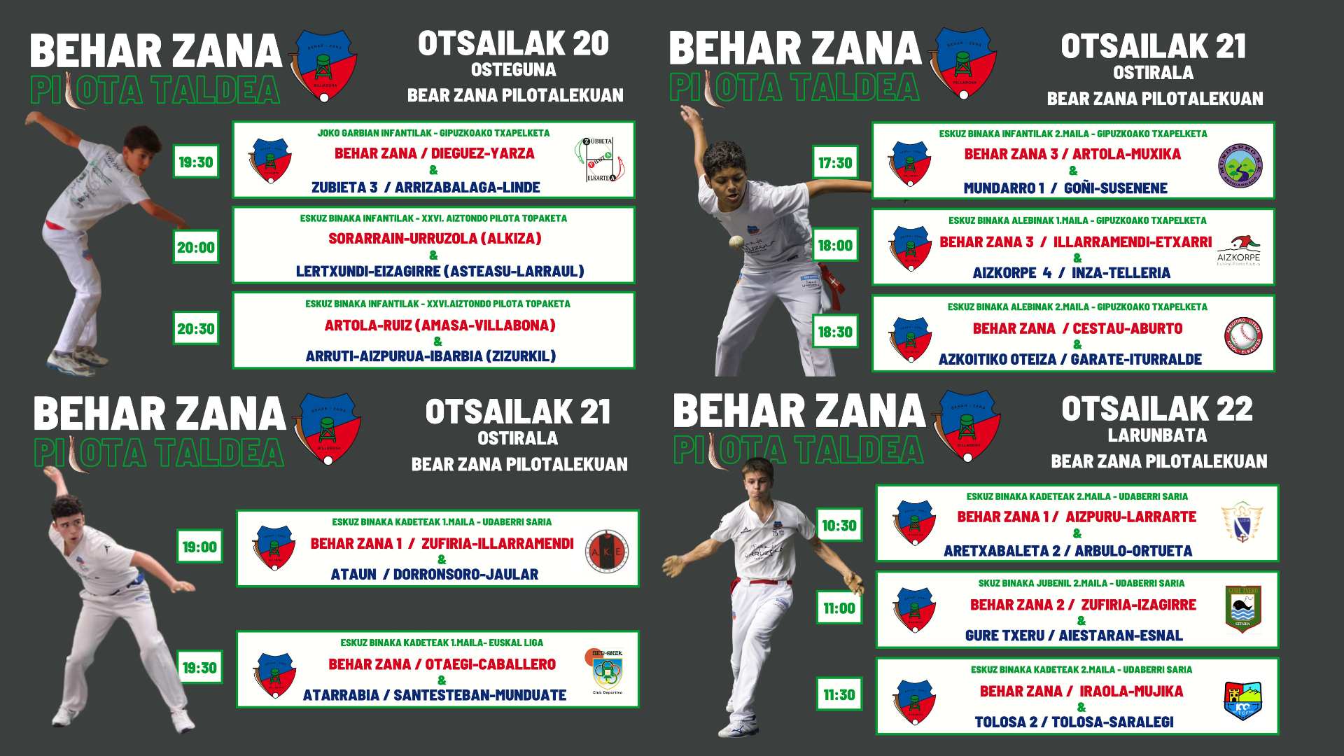 Aiztondoko XXVI. Aiztondo pilota topaketa jokatzen jarraituko dute Aiztondo bailarako herrietako taldeetako pilotariak. Villabonan Infantilek jokatuko dute aste honetan. Egutegi guztiak ikusteko egin klik hemen.