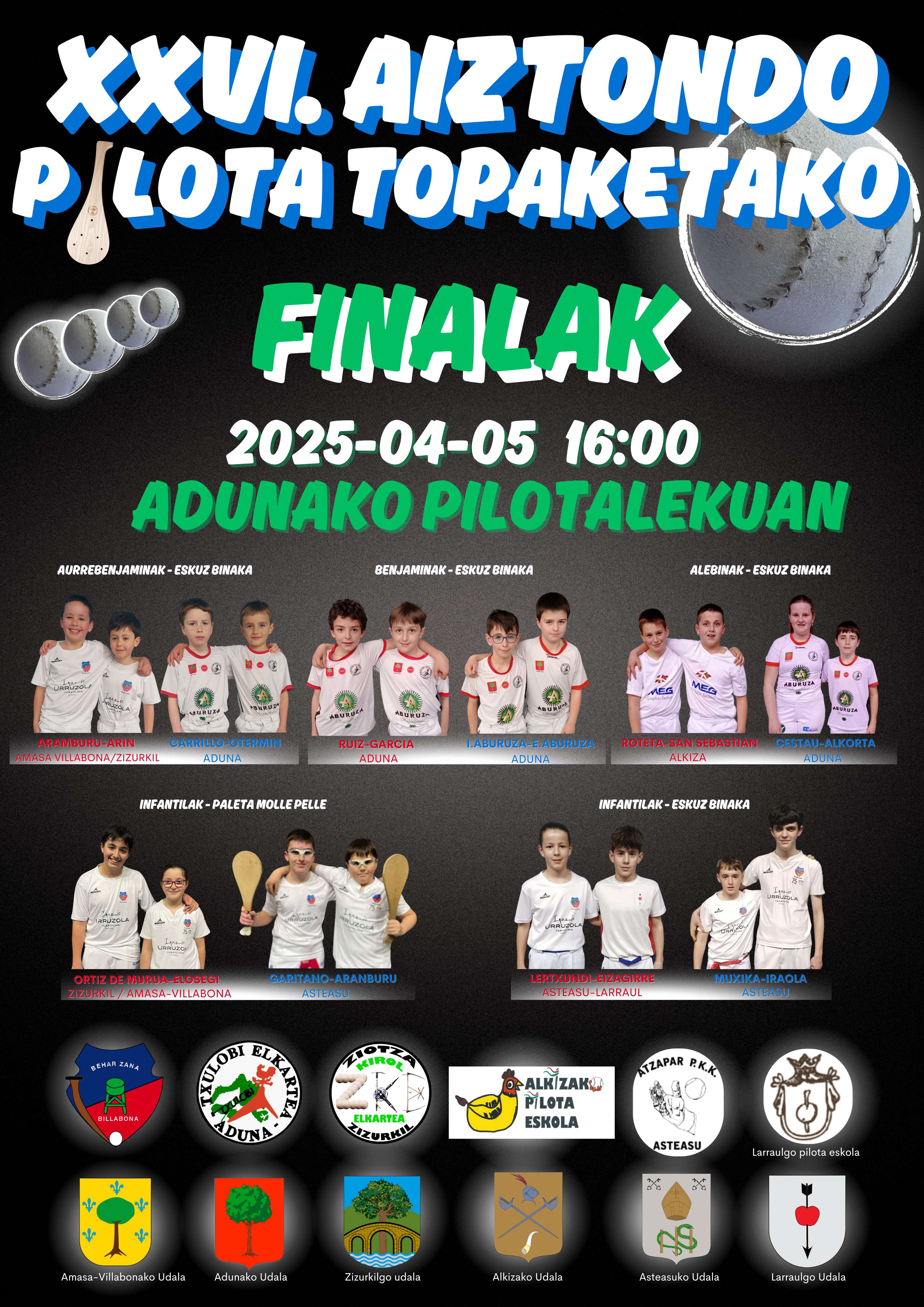 Benjamin mailan eskuz binaka, bi bikoteak Adunakoak eta Txulobikoak: Ruiz-Garcia alde batetik eta E.Aburuza eta I.Aburuza bestetik. Alebin mailan eskuz binaka Adunako Alkorta eta cestau Adunatik Txulobikoak eta Alkizako Roteta-San Sebastian. Paletaz binaka, Behar zanako laukotea iritsi da. Ortiz de Murua-Elosegi Zizurkil-Villabona ordezkatuz eta Garitano-Aranburu Asteasu ordezkatuz. Azkenik, infantiletan eskuz binaka Behar Zanako laukotea iritsi da. Lertxundi-Eizagirre bikotea Asteasu eta Larraul ordezkatuz eta Asteasuko Muxika eta Iraola.gogorra izango dute. Ligaxkan finaleko aurkarien aurka Lanzeta eta Eizagirrek irabaztea lortu zuten arren, beste partida bat izango da.