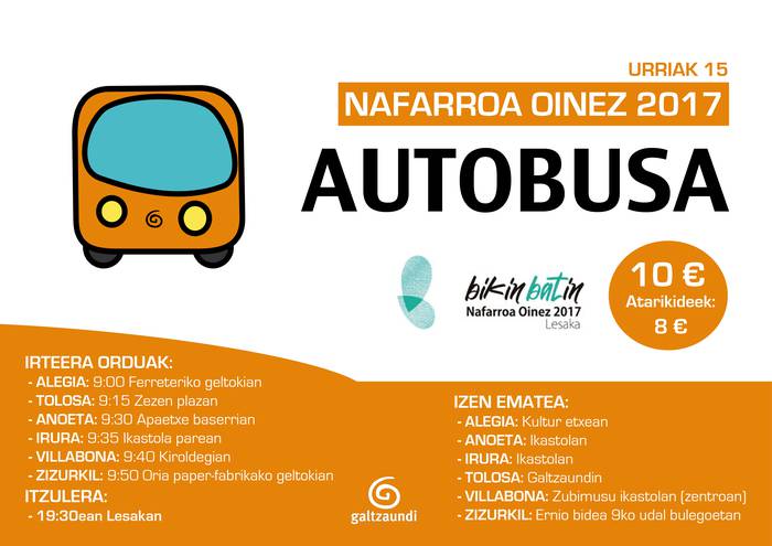 Autobusak 9:00etatik aurrera irtengo dira eta itzulera ordua 19:30ean izango da, Lesakan. Hauek dira autobusen irteera puntuak eta ordutegiak herriz herri:
