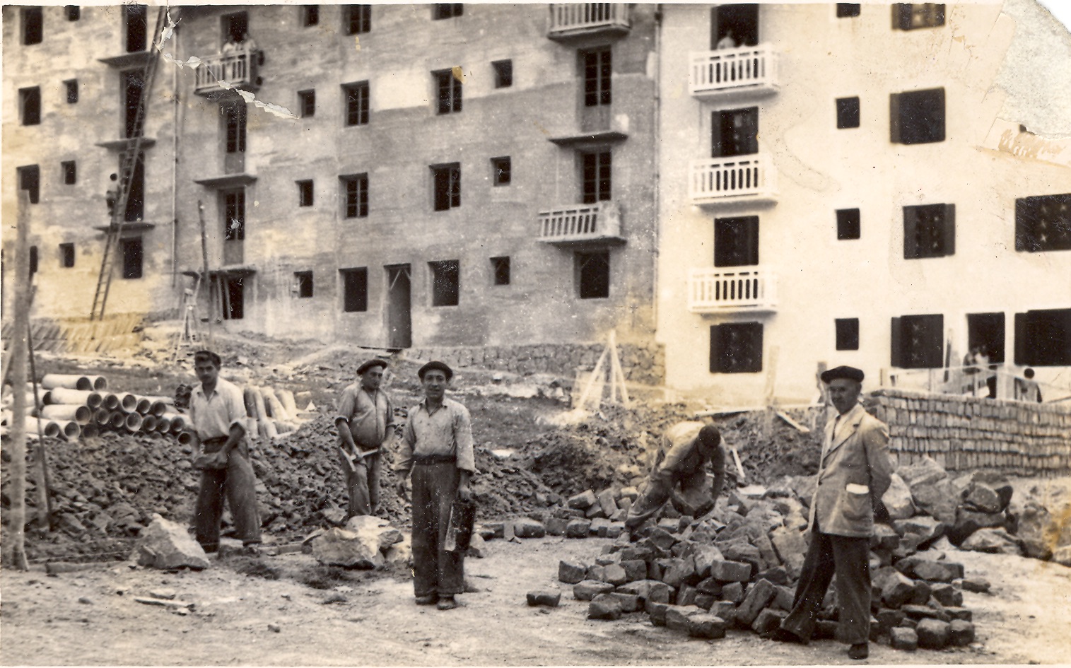 «Aire, eguzki eta argitasunez betetako etxe handi eta garbiak» zirela esan zuen Maiora parrokoak inaugurazioan. Lehen biztanleetako asko bikote ezkonberriak izan ziren. Familia ugariak izaten ziren orduan, kasu askotan 8, 9 edo 11 seme-alabakoak. Auzoan jaiotako lehen haurraren familiari ohea, sehaska eta armairua oparitu ziola agindu zuen parrokoak eta Cortes familia izan zen zorteduna, Andres jaio zenean. Ez zen umerik falta auzoan eta herritik aparte zegoenez, bertan egiten zuten bizitza, elkarrizketatutako bizilagunek adierazi dutenez. Lehen telebista Saez familiak ekarri zuen eta, beheko solairuan bizi zirenez, etxeko leihoak zabaldu eta kanpotik ikusten zuten ume askok. Pixkanaka ugaldu ziren telebistak eta telebista propioa izan arte ondoko bizilagunen etxeetan ikustea beste aukerarik ez zen. Arriola anaiek Caobania zirkua muntatzen zuten auzoan bertan, eta bizilagunek aulkiak etxetik jaitsita ikusten zuten. Tomas Regillagaren akordeoiaren inguruan festa ugari antolatzen ziren, tarteka isunaren bat ere jasoz.