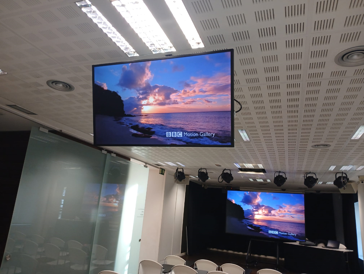 Gainera, beste pantaila osagarri bat ere instalatu da, 43 hazbetekoa, sabaitik zintzilik eta aretoko atzealdeko ikusleek ikusteko. Soinuari dagokionean, sistema berria aretoko bozgorailu-sistemara konektatu da.
