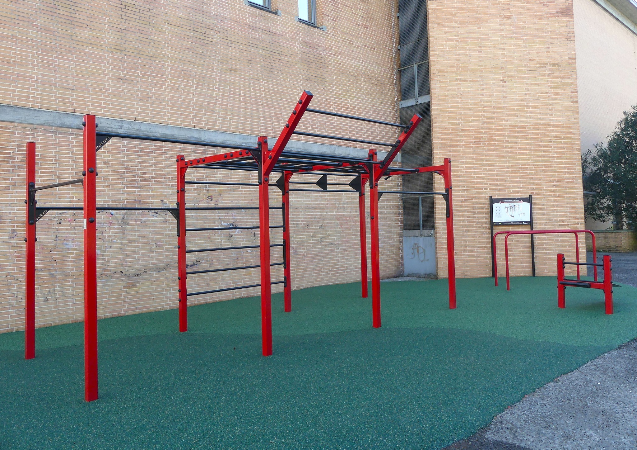 Guztira, ariketa ezberdinak egiteko zortzi elementuz osatzen da parke hau: barra arruntak, barra inklinatuak, dominadak egiteko barra, barra triangeluarrak, eskilara horizontala, horma-barrak, barra paraleloak eta abdominalak egiteko bankua.