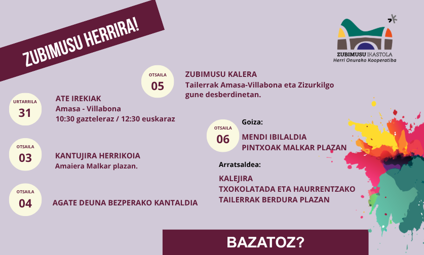 Bai Amasa-Villabona eta baita Zizurkilen ere, ikasleekin eta familiekin gozatzeko hainbat eta hainbat ekimen antolatu ditugu, beraz anima zaitezte jarduera horietan parte-hartzera!