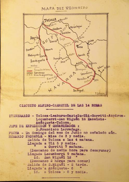 «Denak kale-umeak» zirela adierazi du Agirrek: «Mendizaleak ziren, baina gorputzari hainbesteko estualdia emateko ere ez». Hitzeman ondoren egingo zutela, nola egingo zuten prestatzen hasteaz gain, zenbat denbora beharko zuten ere pentsatzen hasi ziren. Hamalau orduko kalkulua egin zuten. «Idatzizko konpromiso bat ezarri zuten, eta ibilbide bat marraztu, egungoa. Halaxe izendatu zuten: Circuito alpino carretil de las 14 horas». Larrañaga zen espedizioko burua, eta data oraindik zehazteko zegoen, ekaineko igande bat. 03:30ean Santa Maria elizako meza entzun ostean, 04:00etan irtengo ziren, Ulin gosalduko zuten, 12:00etan Aralarko San Migelen bazkaldu, Amezketara iritsi, eta amaitu Tolosan.