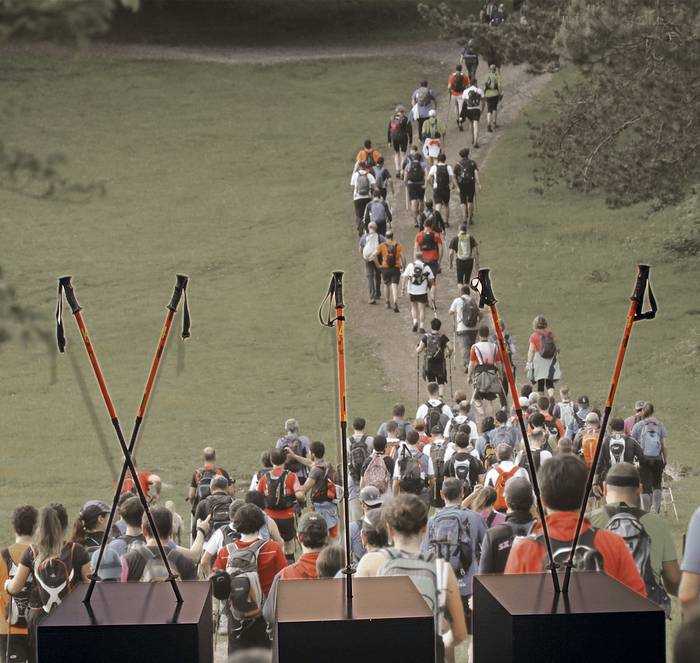 Haitzuloen barrenean egon ohi dira labar-pinturak, bihotzean, barne-barnean. Labar-pinturak haitzuloetan nola, halaxe dago egituratuta 14 Orduko Ibilaldiaren erakusketa, Tolosako Aranburu jauregiko beheko solairuan. Barren-barrenean, hamalau mendizalek ereindako hazia, eta erakusketaren sarreran, azken urteetako ibilaldien kartelak, motxilak, kantinplorak, aldizkariak… Atzekoz aurrera dago erakusketa; zenbat eta urrunago egon sarrerako atetik, orduan eta atzerago denboran.