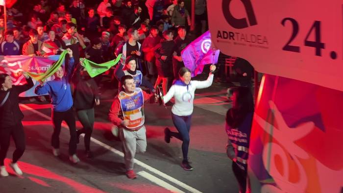 Aitor Olazabal Atarikideari egokitu zaio aurtengo Korrikan ATARIAren lekukoa eramatea, eta harekin batera, Amaia arrebak, bien bikotekideek eta Aitor eta Amaiaren gurasoek egin dute gure kilometroa pankartaren aurrean; ehunka euskaltzale zituzten atzetik Amarotz auzoan sartu direnean.