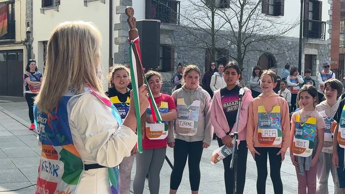 Pili Legarra alkate ohiak mezua luzatu die herriko gazteei, Korrika Txikiaren barruan egin dioten omenaldian.