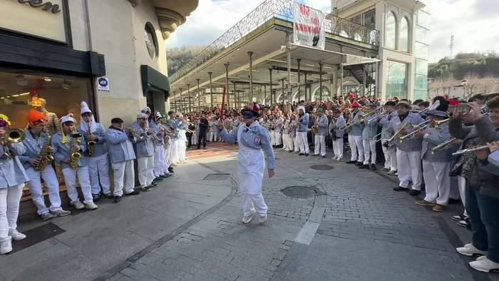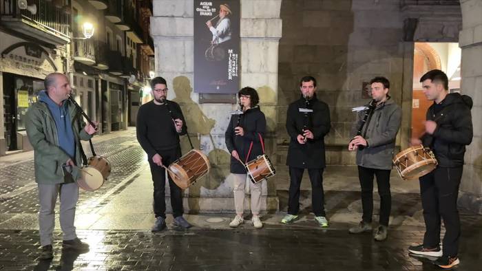 Inauterietako suziria bota eta gero, Pintxana txarangakoek pieza ederra jo dute Atari kalean.
