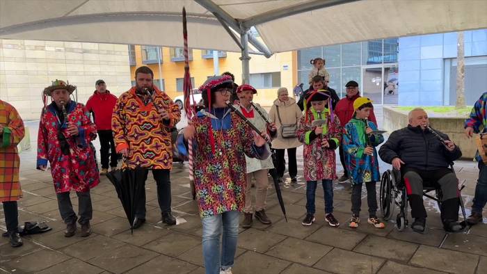 Pieza ederrak jo dituzte Ozenki Txistulari Taldeko kideek. Gaurkoan ezohiko lekuetan, aterpe bila ibili baitira euria dela eta.