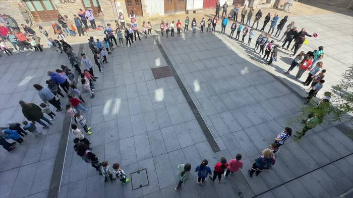 Bi multzotan banatuta, Berastegiko eskolako ikasleak Xiberutikan Mendebaldera abestia dantzatu dute.