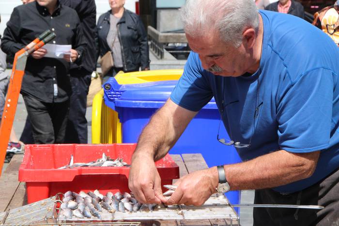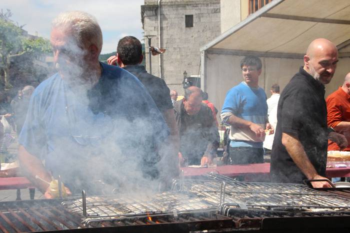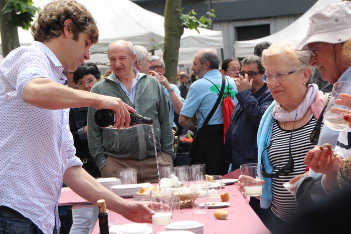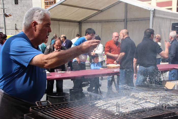 Katxiña erretegiko txakolin berriak eta sardina usainak erakarririk, kresalez zirpiztindu dira herritarrak, gustura.