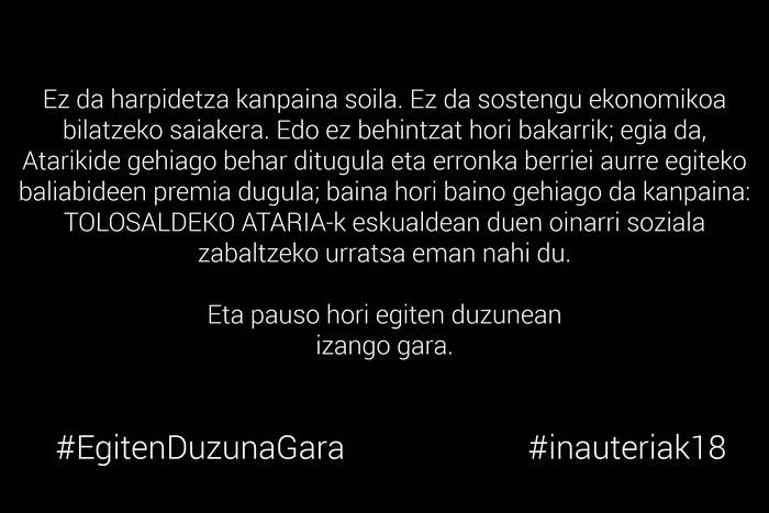 Ez diogu hau kapritxo hutsagatik: lagundu iezaguzu. Eduki hau guztia doan ikusten duzu ez dugulako irudikatzen euskarazko hitzik gabeko Tolosalderik. Atarikide, iragarle eta erakunde askoren laguntzarik gabe ezinezkoa litzateke. Zenbat eta komunitate handiagoa sortu, orduan eta sendoagoa izango da ATARIA: zurekin, zuekin. Ez utzi biharko gaur egin dezakezuna: egin zaitez Atarikide!
