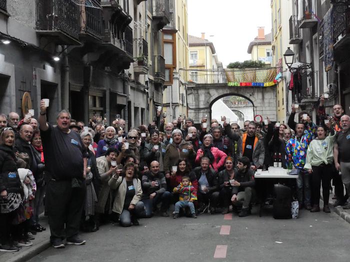 Bestalde, Kalera plataformakoek brindisa egin dute txupinazoaren ondoren, Amaiur tabernaren atarian.