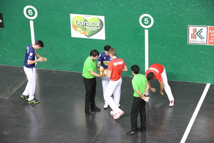Lehen partidan, Egiguren V.a eta Bikuñak 18, eta Dario eta Erostarbek 16 bukatu da partida. Ostean, partida nagusiko pilotariak atera dira kantxara txalo eta oihu artean: Oinatz Bengoetxea eta Jon Mariezkurrena, eta Jokin Altuna eta Ladis Galartza.