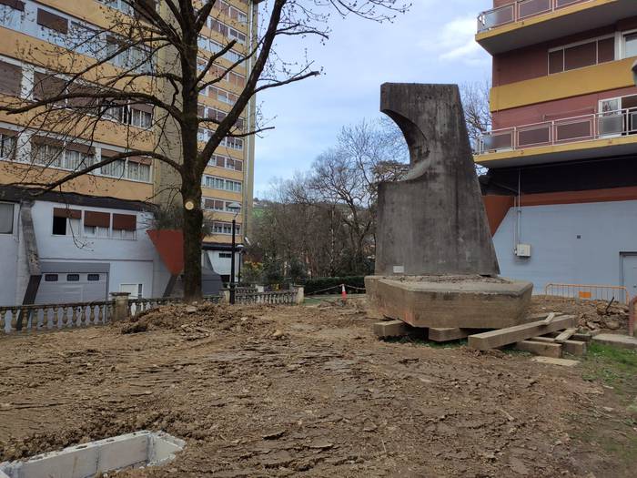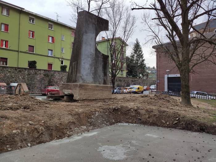 Eskulturak 38.000 kiloko pisua du eta garabia egokiarekin lekuz mugitu zen lehenik, zorua egonkortzeko lanak egiteko. Eskultura mugitzean behin-betiko lekualdatzeko beharra sortu zen, lur azpian zegoen eskulturaren zatiaren egoera ez baitzen egokia. Hortaz, eskultura lekualdatzeko, lurra zulatu zen lehenik; gero, 60 zentimetroko balastozko geruza bat ipini zen; ondoren, erruloa pasa zen, eskultura trinkotzeko; eta azkenik, armadura jarri eta 40 zentimetroko hormigoizko geruza bat bota zen.