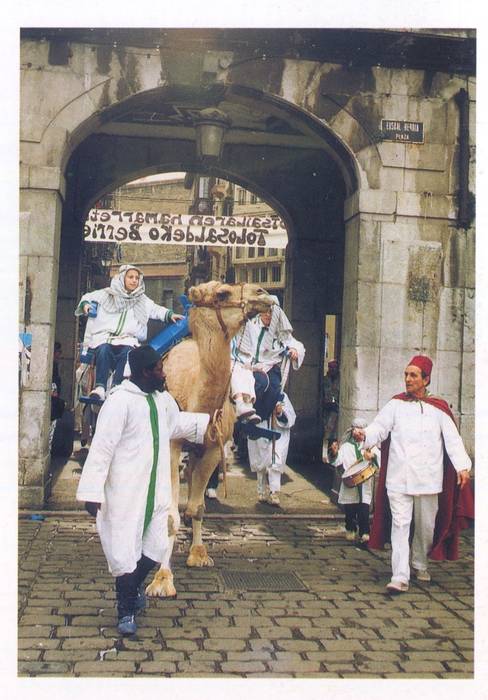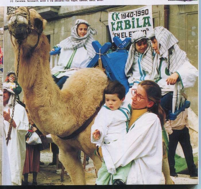 [Barreak]. Badugu beste anekdota bat hor. Beste lekuetan ikusten genuen gameluak erabiltzen zituztela, parkeetan eta, haurrak paseatzeko. Halako zerbait egin nahi genuela sartu zitzaigun buruan eta Santanderrera (Espainia) joan ginen, Cabarcenora. Tolosara ekarri genuen; Eskolapioak eraikitzen ari ziren eta obra horretan sartuta nengoenez, leku bat egokitu genien eta han lo egiten zuen gameluak. Sekulako zeresana eman zuen Tolosako kaleetan harekin agertu ginenean. Haurrak esertzeko aulki bat zeraman bizkarrean eta txarangarekin batera konpartsa moduan atera ginen. Baimenak eta lortzen kosta zitzaigun, baina egin genuen. Baimenean jasota dago sei urte zituela gameluak eta Blanco zuen izena. 9.840 pezetako prima ordaindu genuen. 1990ean izan zen hori, agiria otsailaren 26an sinatuta daukagu. Urte hartan Kabilak 50 urte betetzen zituen eta zerbait berezia egin nahi izan genuen.