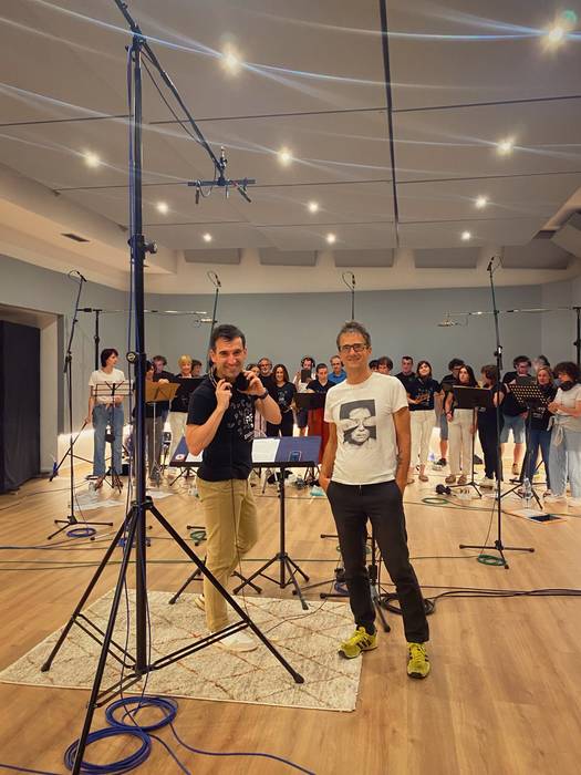 Aitor Biain Oñatiko abesbatzako zuzendaria eta Juantxo Zeberio, diskoaren grabaketako une batean. Argazkia: Juantxo Zeberio.