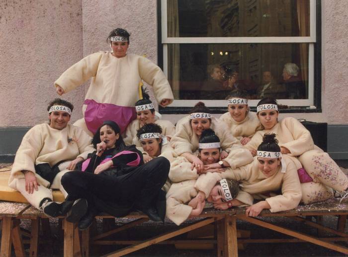 Jauregi: Gizon kuadrillak izaten ziren, senitartekoekin parte hartzen zutenak. Uste dut beste emakume kuadrilla bat ere izaten zela herriko beste gune batean. Konpartsari izena ez genion guk jarri. Herritarrek jarri ziguten, artxibo aurrean jartzen ginen neska talde bat ginelako.