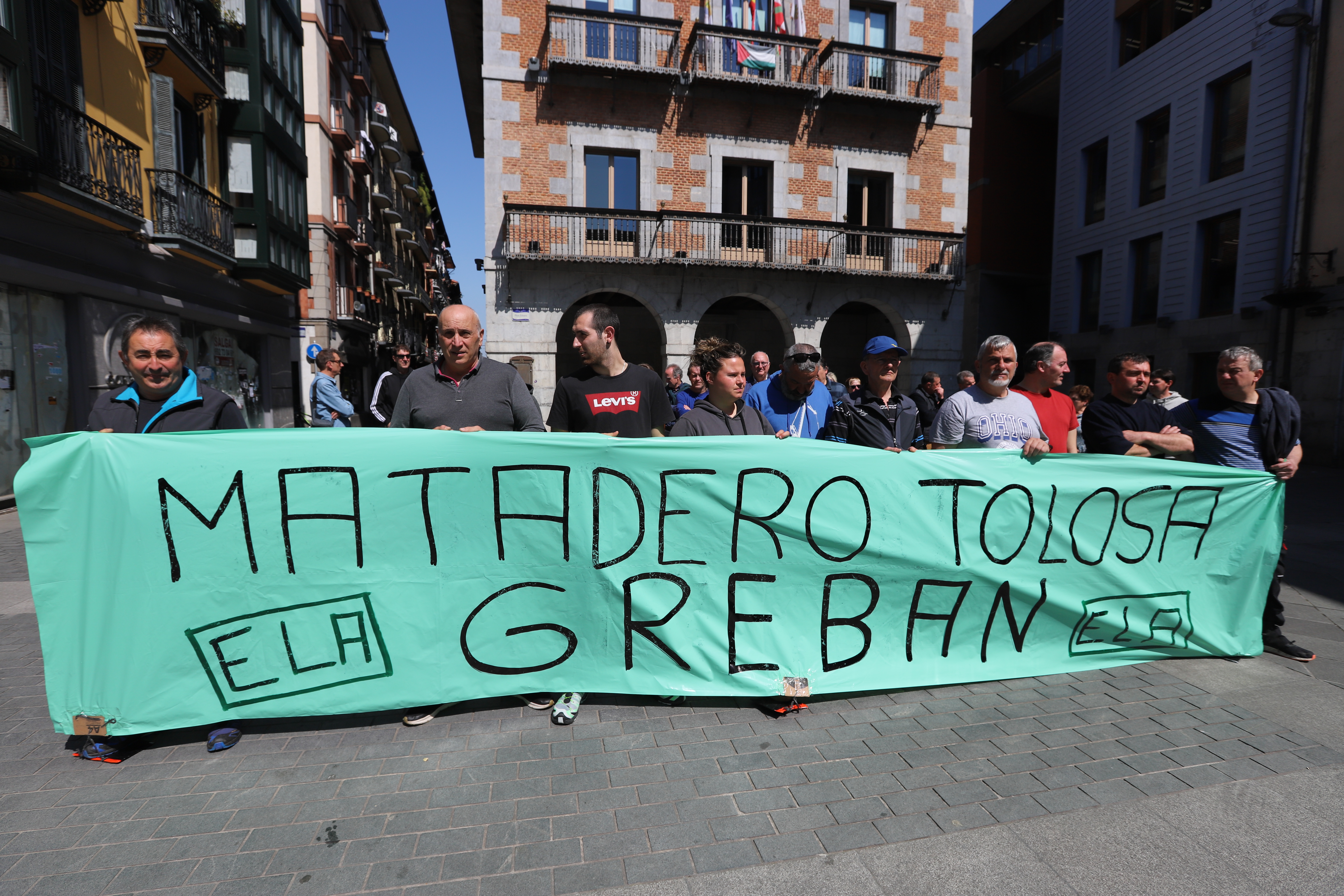 Tolosako hiltegiko langileek elkarretaratzea egin dute, eguerdian, udaletxe aurrean. Hiltegiko langileekin batera, eskualdeko zenbait abeltzain eta harakin ere izan dira mobilizazioan.