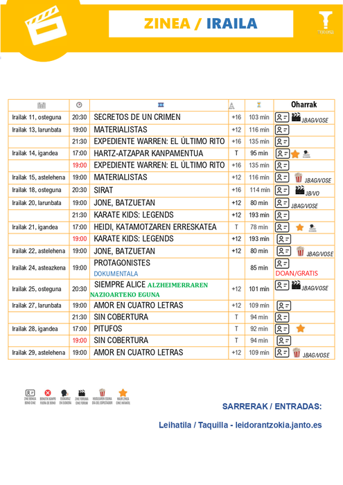 Ontzat jo duten beste gauzetako bat zine bonuarena izan da. Inkesta erantzun dutenen %80k erosten du. Ikasturte honetan ere eskuragarri izango dira, Leidorreko leihatilan bertan, bere ohiko ordutegian, baita leidorantzokia.janto.es webgunean ere. 10, 20 edo 30 saiotarako bonuak daude, guztiak ere, urtea amaitu bitarte erabili beharrekoak.