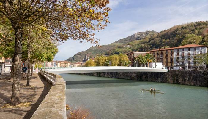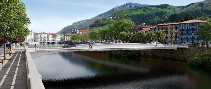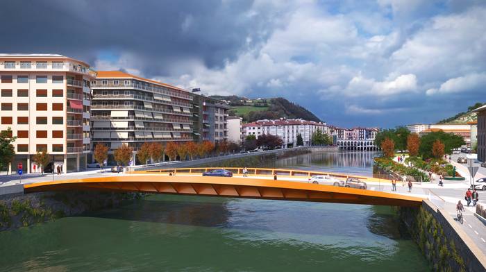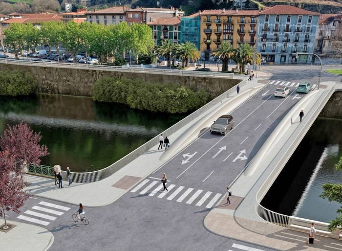 Zubi-zutaberik gabeko zubia proposatu dute, bao bakarrekoa. Era berean, galtzadatik gorako egitura du, ur-azalerari dagokionez ahalik eta babes hidrauliko handiena lortzeko eta etorkizunean uholdeak saihesteko. Bi habe nagusitan oinarritzen da: habe horiek kurbatuak dira, ‘arrain-silueta’ baten antzeko altxaeran. Zubiko edozein espaloitatik inguruaren begi-lerroak mantentzen dira. Halaber, ezkerreko ertzeko espazio faltari irtenbidea ematen dio.