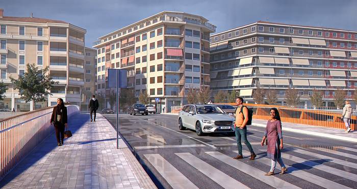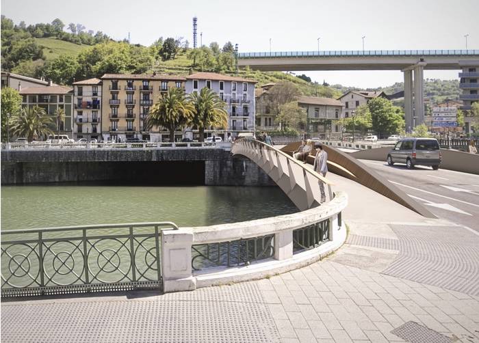 Zubiaren beraren egitura aprobetxatuz, ibilgailuen trafikotik babes bisual bat sortzen du, ibaira eta bistetara emana dagoen egonleku bat sortzeko. Bere altuerak gainetik ikusteko aukera emango dio beti zubia gurutzatzen duen oinezkoari. Euskarriek hartu beharreko espazioa txikia izan dadin, isostatika-habeko zubi bat proposatzen dute, zimenduak oso inbasio maila txikia sortzen dutelako. Bi euskarriko habe-zubia da, eta ez da sentibera deformazioekiko. Horrez gain, mantentze-lan gutxi eskatzen du eta ikusmen-inpaktu txikia du. Barne-diseinuari dagokionez proposatu dute eskudelen gainean informazio-panelak jartzea, LED argiztapen jarraitua, eserleku jarraitua oinezko pasabidean, altzairuzko saihetsak eta iragazkortasuna maximizatzeko altzairu herdoilgaitzezko baranda, besteak beste.