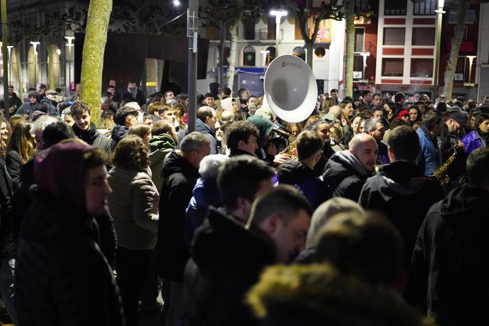 Afaldu ondoren, 23:30 aldera, zenbait abesti jotzen dituzte elkartean, tartean, Parrita pasodoblea, eta 23:45 aldera abiatzen dira Trianguloara. «Denboraz justu ibiltzen garenez, Korreo kalean barrena, suziriak eta traka prestatzen hasten gara —urte batetik bestera handiagoa izaten da leherketa—, eta eztandarekin batera lehertzen da festa», esan du Arrizibitak.