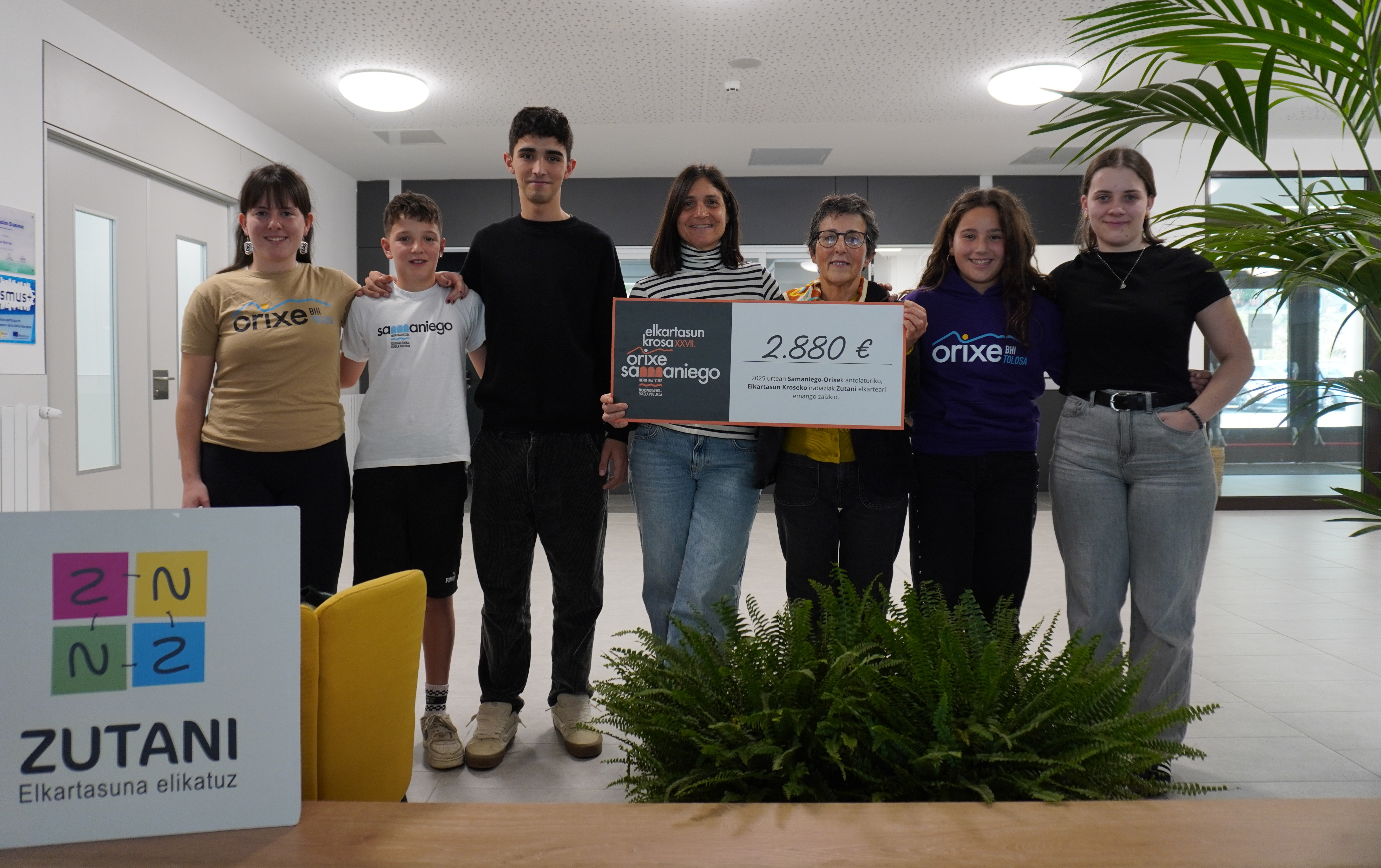 Urtero, elkartasuna helburu duen talde, elkarte edo erakunde bat laguntzen dute antolatzaileek, krosean bildutako diruarekin. Bada, azken edizioan bildutako dirua Zutani elkarteari eman diote, elkarteak egiten duen lan baliotsuari ekarpena egiteko asmoarekin. Aste honetan, Orixeko eta Samaniegoko hainbat ikaslek, bi ikastetxeetako ordezkariekin batera, 2.880 euroko txekea eman diete Zutani elkarteko ordezkariei.