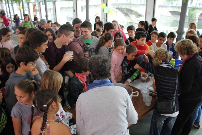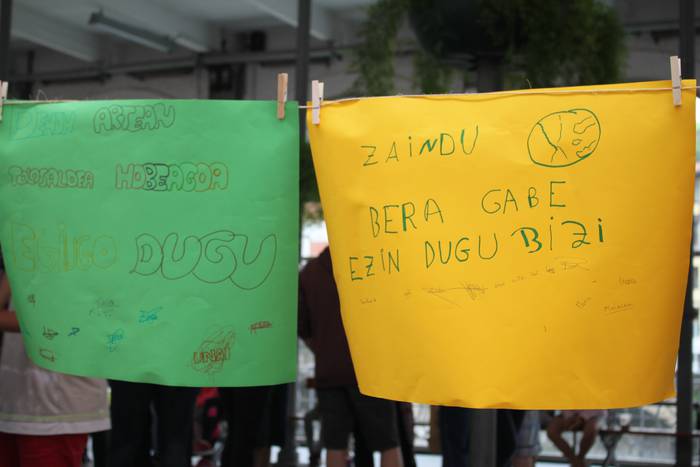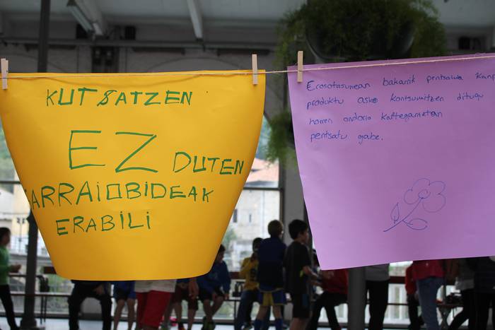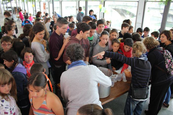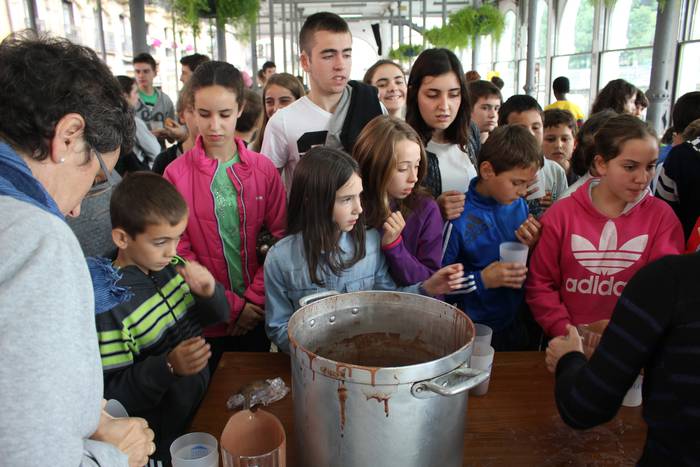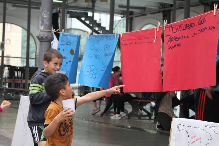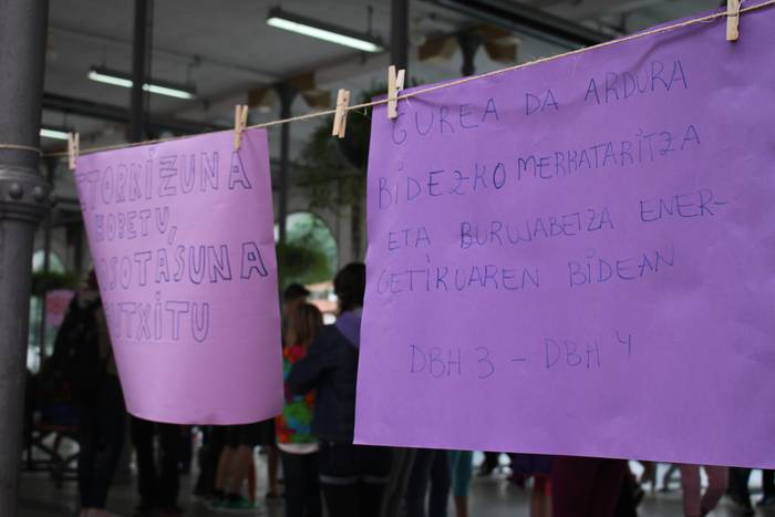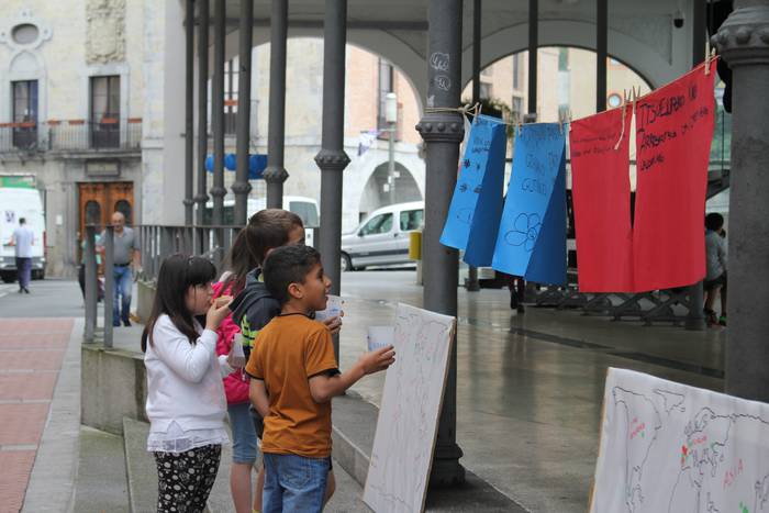 Ondoren, taldeka egin dituzten hausnarketa horietan ateratako ondorioak partekatu eta kartel ezberdinak egin eta kalera begira zintzilikatu dituzte. Amaitzeko, hamaiketakoa egin dute ikasle eta irakasleek. Txokolate beroa dastatzeko aukera izan dute.