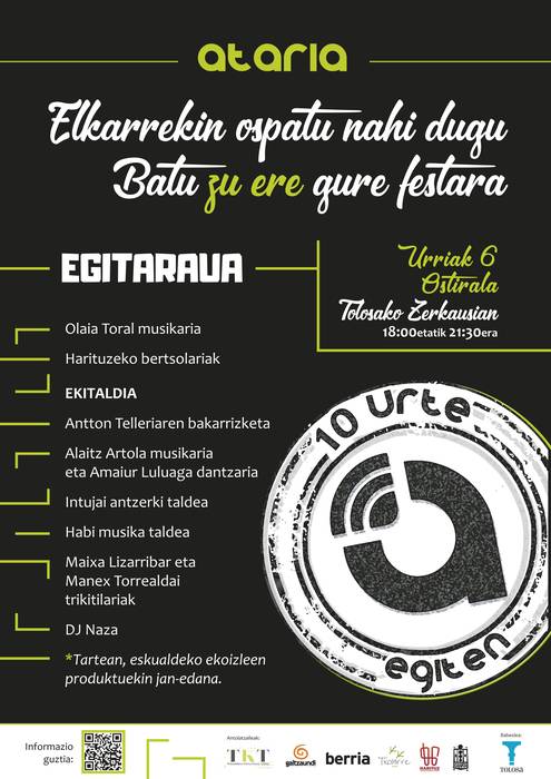 Guztia prest du ATARIAK bere hamargarren urteurrena behar bezala ospatzeko. Urriaren 6an izango da festa Tolosako Zerkausian, eta hamargarren urteurreneko ekitaldiarekin batera, musika, bertsoak, bakarrizketak, dantza eta antzerkia izango dira, eta guztia borobiltzeko, jan-edana. 18:00etan hasiko da festa, eta 21:30ak aldera arte iraungo du.