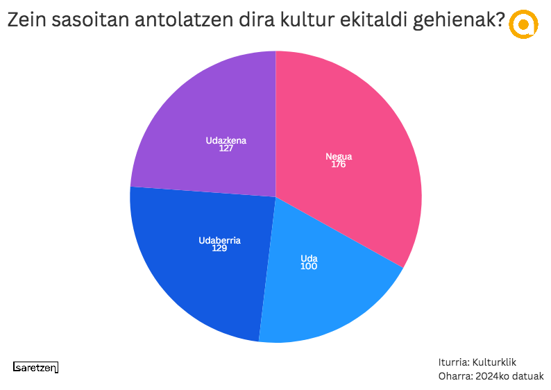 Ekitaldi gehienak neguan eta udazkenean izateak eragin zuzena du ekitaldi horiek egiteko aukeratutako lekuan. Iaz ekitaldi gehienak aterpean egin ziren eta kanpoan 122 izan ziren.