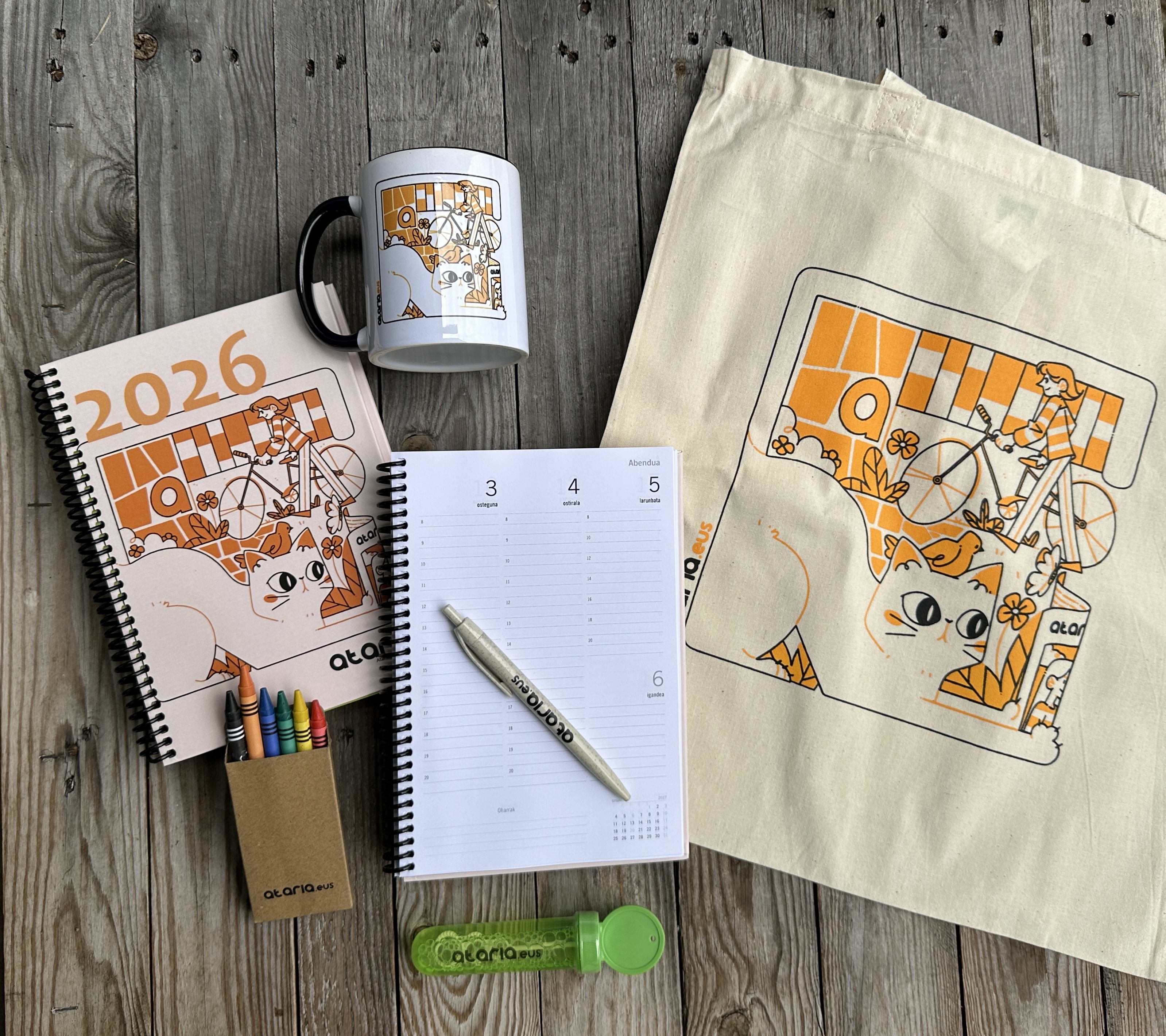 Julen Madariaga Murua ilustratzaile altzotarrak sortu du ATARIAko tote zorro, agenda eta katilu berrietako irudia. Izan ere, eskualdeko sortzaileen lana aintzat hartzeko helburuari eutsiz, oraingoan ere eskualdeko sortzaile batengana jo du ATARIAk material berriaren irudia diseinatzeko. Aurten gainera, haurrei zuzendutako produktuak ere kaleratu ditu. Horiek guztiak, ATARIAren Tolosako egoitzan (San Esteban auzoa, 20) erosi daitezke eta igandeko Asteasuko azokan ere izango da erosteko aukera.