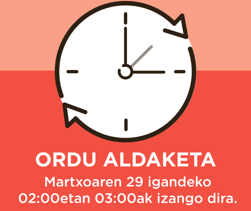 Bihar, igandea, goizaldeko 02:00etan 03:00ak izango dira. Udako ordutegia sartzearekin batera, erlojuak aurreratu beharko ditugu eta, igandeak horrenbestez, ordubete gutxiago izango du.